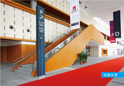 展馆部分由八座单层展馆组成,总建筑面积约16.8万平方米,总国际标准展位5760个,室外展览面积约30000㎡。八座建筑面积同为2.1万平方米的展馆沿着主轴连廊分为四组,相邻展馆共享2000平方米的登录厅,登录厅可设国际标准展位84个。每座展馆净展览面积约 为1.2万平方米,可设国际标准展位720个。每座展馆既可单独使用,适用于灵活的小型展览,同时还可以与其他展馆连通用于大型展览。