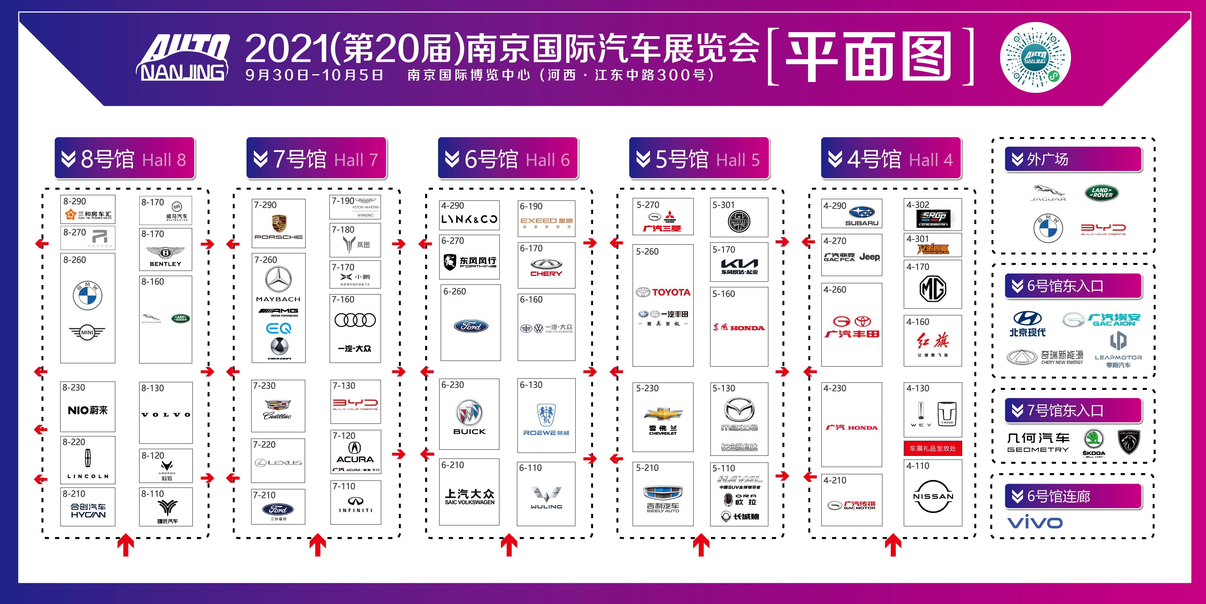 本届车展启用南京国际博览中心5大室内展馆及所有室外场地。室内展馆,4-6馆为中国制造、热门合资品牌展区,7-8馆为进口豪华、新能源造车新势力展区;外广场为捷豹路虎、比亚迪、宝马精品二手车展区。上述展区内的参展品牌均携旗下年度首发、热门主打车型亮相,新车涵盖了进口豪华、主流合资、中国制造、新能源、商务车以及摩托车等各个门类,有计划为“新款”买单的消费者,这一场新车盛宴一定不能错过。